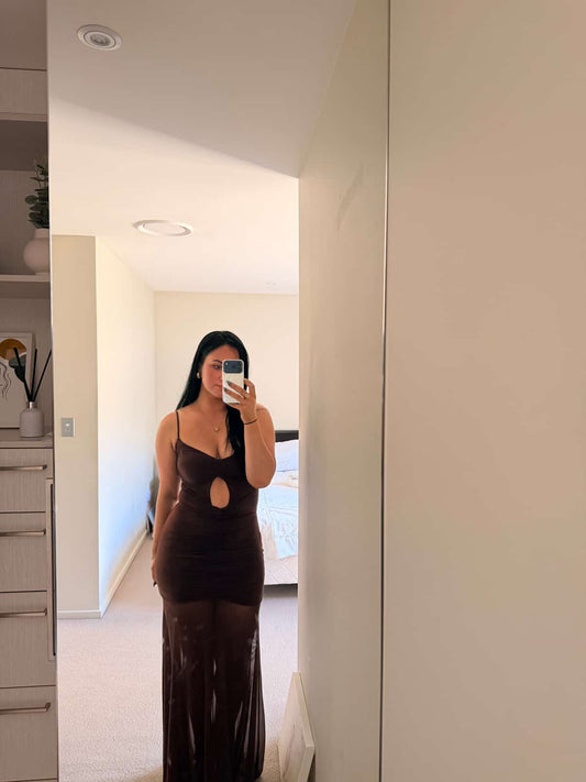 Delaney Slinky And Mesh Maxi Dress in Chocolate
