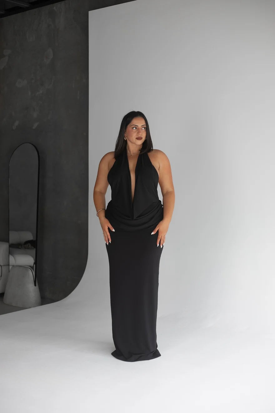 - Draped halterneck forms bust coverage