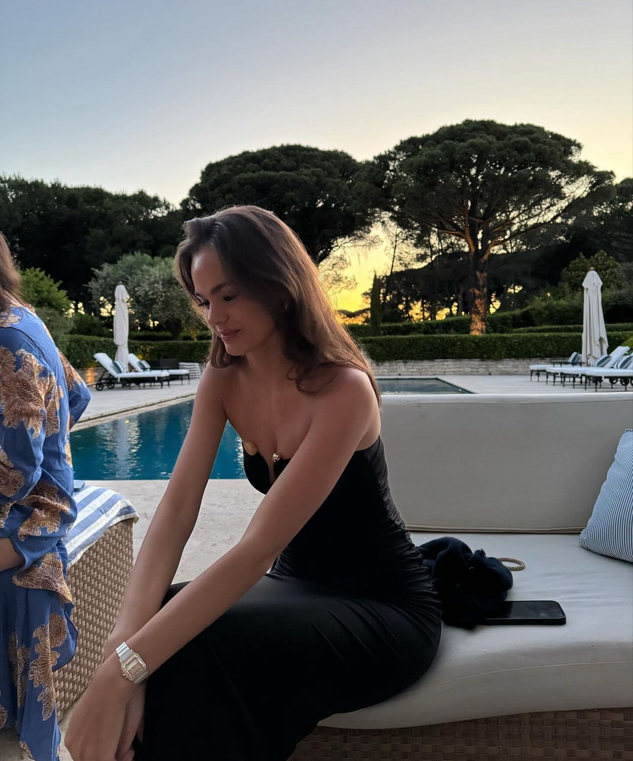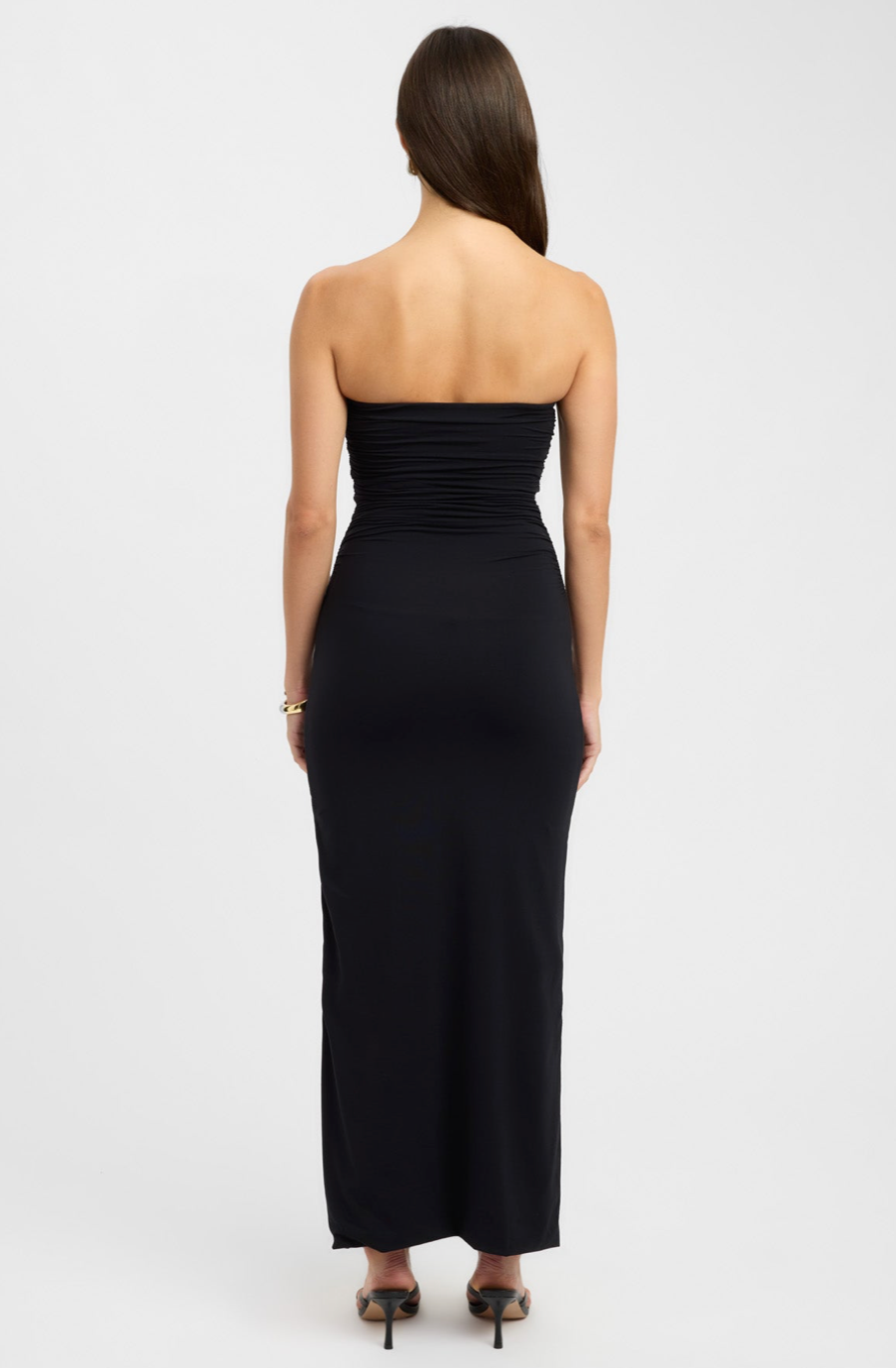 Ruching along the silhouette, a strapless neckline, and bold beaded detailing